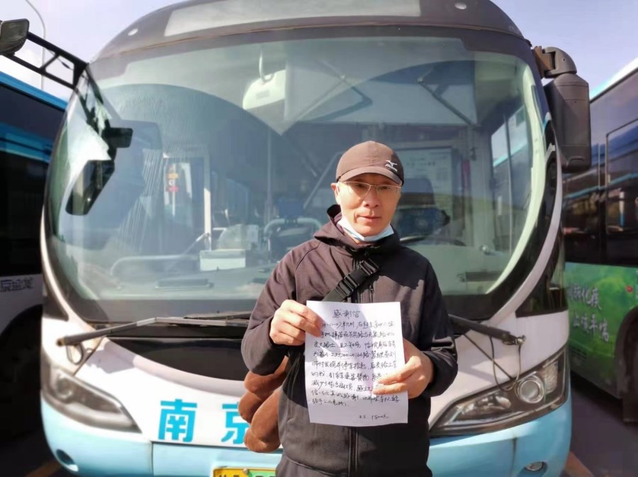 2021年11月9日上午,南京公交164路的劉自震師傅在車隊組織的安全學(xué)習(xí)后,意外見到了第二次趕來給自己送感謝信的陳老先生。見面后,劉師傅風(fēng)趣地說:“幸虧當時你是‘追’我的車,不然我就要下車‘追’你咯!”老先生緊緊地握著劉師傅的手,感嘆道,“謝謝您,幸虧當時遇到了劉師傅您;不然,遲一步,我的手機就要‘粉身碎骨’了!”