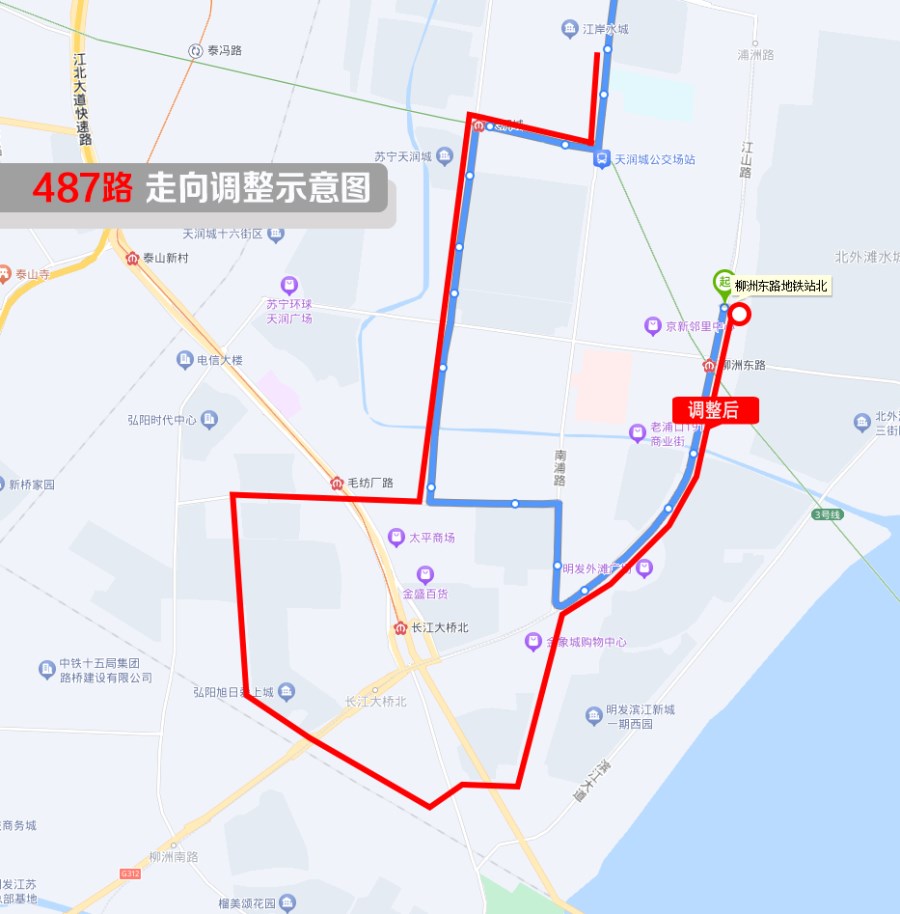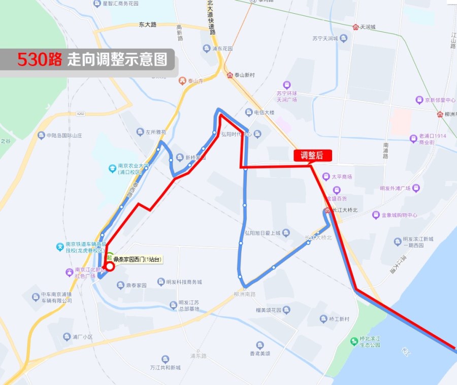 * 線路走向變化:自“鼎泰家園西門”站起,擬沿凱天路、浦環(huán)西路、盛浦路、弘泰西路、弘泰路、高新南路、柳州北路、泰達(dá)路、大橋北路、長江大橋回原線行駛(返程路段相同),其它路段不變。