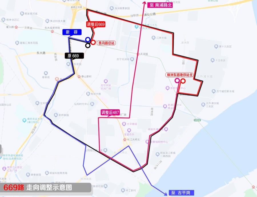 * 撤銷站及換乘說明:點(diǎn)將臺、市社會福利院、南農(nóng)大浦口校區(qū)、泰西路?泰工路、(新橋家園、柳洲北路?泰達(dá)路、柳洲北路?麗島路、小柳工業(yè)園、柳洲北路南、浦珠北路?樂華路、浦珠北路?大橋北路、長江大橋北。說明:此區(qū)間站點(diǎn)可乘新辟越江線路出行)。