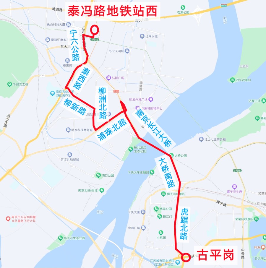 * 具體走向:天華西路、寧六公路、泰西路、柳新路、柳洲北路、浦珠北路、大橋北路、南京長江大橋、大橋南路、虎踞北路至終點(diǎn)站“古平崗”運(yùn)行(返程路段相同)。