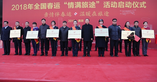 2月1日春運首日上午9時,交通運輸部、公安部、國家安全監(jiān)管總局、中華全國總工會、共青團中央等五部委在南京南站客運樞紐舉行了2018年全國春運“情滿旅途”活動啟動儀式。